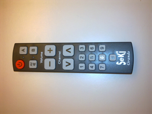 Seki ist die einfache, lernfähige Universalfernbedienung für ein oder zwei Geräte. Sie zeichnet sich durch extra grosse Tasten, einem Einschaltknopf, Gerätetypen A oder B, Volumen, Senderwahl und direkte Senderwahl mit Zahlenfeld und der Stummtaste aus. Die Infrarotbedienung ist lernbar, das heisst sie ersetzt nicht zugängliche Fernbedienungen.