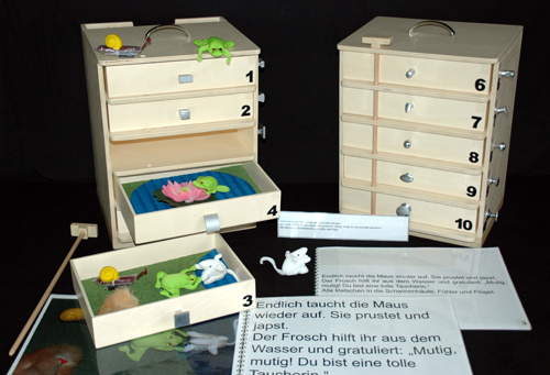 Ein Kinderbuch über den Tastsinn zugänglich zu machen, bedeutet mehr als nur Bilder umzuwandeln, die für Sehende konzipiert sind. Die Wahrnehmung und der Vorstellungsaufbau über den Tastsinn haben bei früh erblindeten Kindern eigene Gesetzmässigkeiten. In ihrer Masterarbeit geht Carmen Ricklin diesem Thema nach und experimentiert zusammen mit Kindern am bestmöglichen Aufbau von zehn Tastbildern und vier Hauptdarstellern, die für eine ausgewählte Geschichte notwendig sind: ein Frosch, eine Maus, ein Spatz und eine Schnecke. Aus dem Bilderbuch «Mutig, mutig» werden zwei nachttischgrosse Schubladenelemente. Blinde Kinder haben sie getestet und gezeigt, dass sie die so aufgebaute Geschichte aktiv miterleben konnten.
