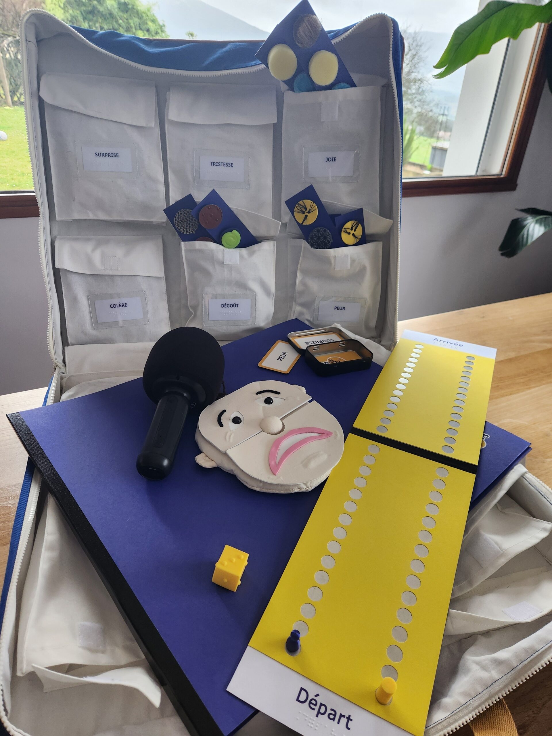 La mallette de régulation émotionnelle présente des outils didactiques avec des éléments auditifs et tactiles. / Conception pédagogique Dannyelle Valente, réalisation Mes Mains en Or; photo: MAD