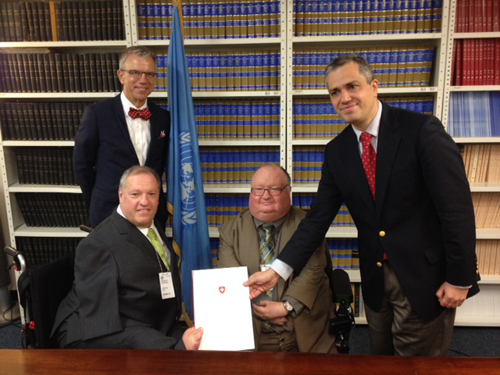 L’Assemblée générale des Nations Unies a adopté la CDPH le 31 décembre 2013. Elle constitue le fruit d’une collaboration avec la société civile, notamment avec les personnes handicapées et les associations qui les représentent. Ces acteurs en ont d’ailleurs largement façonné le contenu. Ainsi, traitées désormais sur un pied d’égalité avec les autres, les personnes handicapées doivent pouvoir bénéfi cier d’une participation et d’une intégration pleines et effectives à la société. La CDPH a déjà été ratifi ée par 143 états, ainsi que par l’UE. La Suisse participe désormais également à ce mouvement. Après l’adoption de la Convention par l’Assemblée fédérale le 11 décembre 2013, le Conseil fédéral a signé l’instrument d’adhésion le 9 avril 2014. Le 15 avril s’est déroulée dans le quartier général de l’ONU à New York la cérémonie de ratifi cation en présence de Pierre Margot-Cattin, préside nt du Conseil Egalité Handicap, et du conseiller national Christian Lohr. C’est à la mi-mai que la CDPH est entrée en vigueur en Suisse.