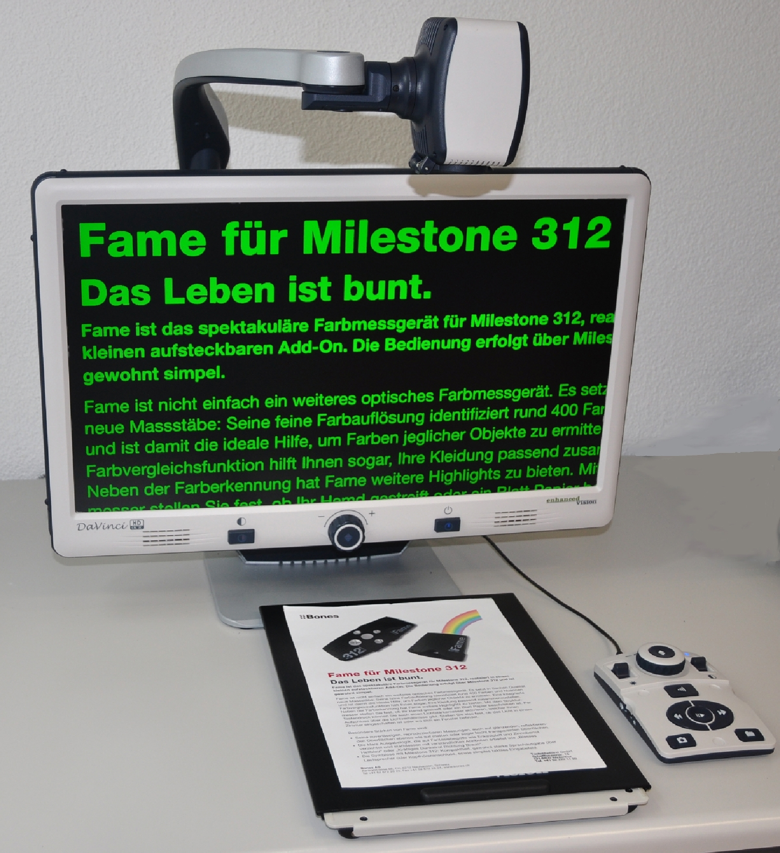 Das DaVinci ist ein leistungsstarkes Bildschirmlesegerät mit einer hochauflösenden 3-in-1 HD Kamera und Sprachausgabe. Mit HD lässt sich die tatsächliche Farbintensität der Vorlage erleben. Das Bild erscheint in einer kristallklaren Qualität, ganz gleich ob man den Kontrastmodus mit tiefem Schwarz und kräftigem Weiss wählt oder den Echtfarbmodus nutzt. Zur Abwechslung kann man sich Dokumente auf Knopfdruck vorlesen lassen. Die überaus menschliche Stimme macht es leicht, spannende Texte über Kopfhörer oder Lautsprecher zu verfolgen. Bei Bedarf lässt sich die Vorlesefunktion starten. Das mit der Kamera aufgenommene Bild wird von einer sogenannten OCR-Software erfasst und mit einer Stimme wiedergegeben.